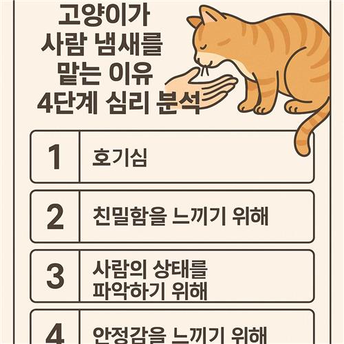 반려묘가 우리 손, 옷, 머리카락, 심지어 신발까지 유심히 냄새 맡을 때가 있죠. 단순한 호기심만으로 보기엔 행동이 꽤 체계적입니다. 고양이는 후각과 보메로 나잘 기관을 통해 사람의 상태, 감정, 습관, 환경 변화까지 폭넓게 읽어냅니다. 이 글에서는 고양이가 사람 냄새를 맡는 행동을 네 단계 심리 모델로 나눠 이해하기 쉽게 설명하고, 집에서 바로 적용 가능한 대응 팁과 오해 바로잡기까지 차근차근 정리했습니다. 목차의 각 항목은 아래 STEP 2~7의 개별 섹션과 정확히 연결됩니다.