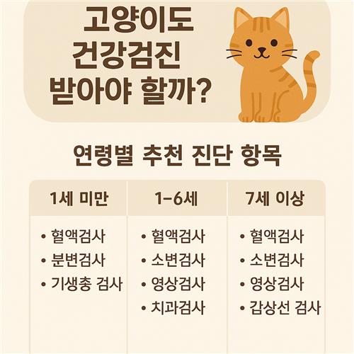 특히 반려묘의 나이에 따라 어떤 검사를 받아야 하는지 궁금했던 분들에게 꼭 도움이 될 거예요.