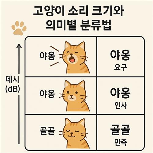 고양이 소리의 크기에 따라 어떤 감정 상태를 나타내는지 정리해봤어요.