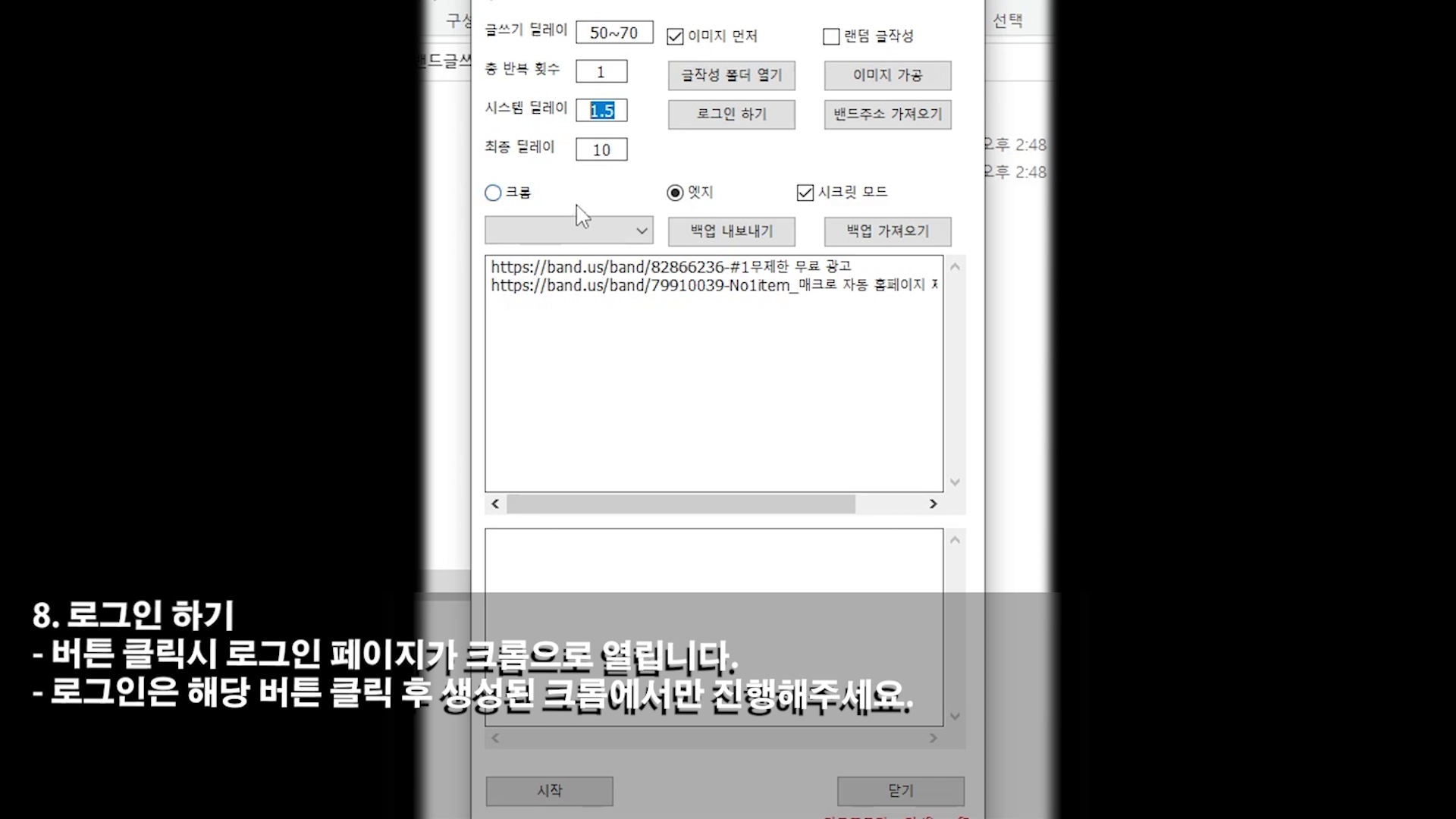 전체 밴드SNSURL에 내용을 순차적으로 게시글쓰기(혹은 랜덤)이 반복횟수 1회입니다.